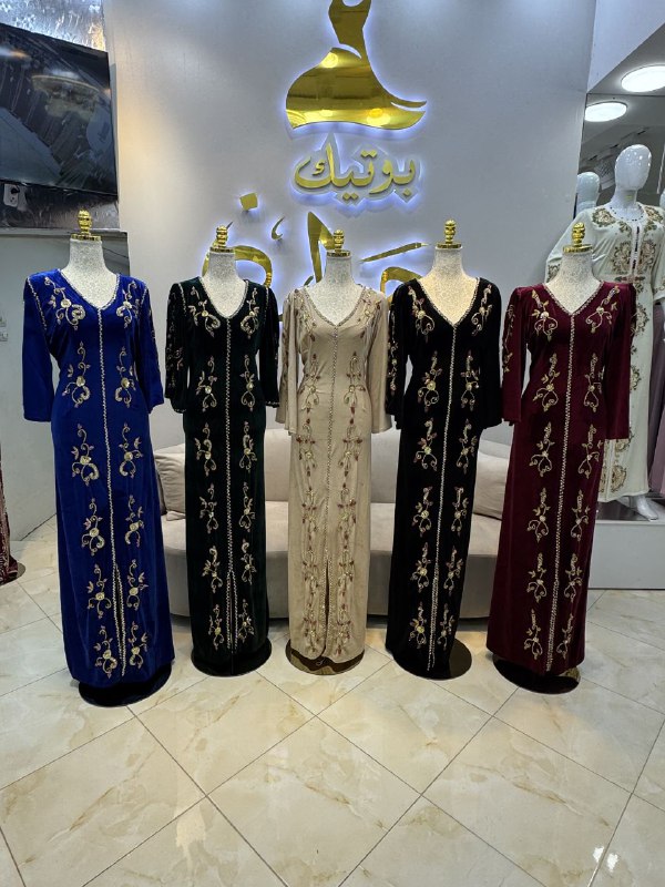 كل فستان يمتاز بقصة طويلة تتدفق برشاقة، مع تفاصيل حزام يبرز الخصر بشكل جذاب. الأكمام الطويلة تضيف لمسة من الأناقة، بينما تتلألأ التطريزات الراقية على الصدر، مما يعكس حرفة عالية في التصميم.ألوان جذابة