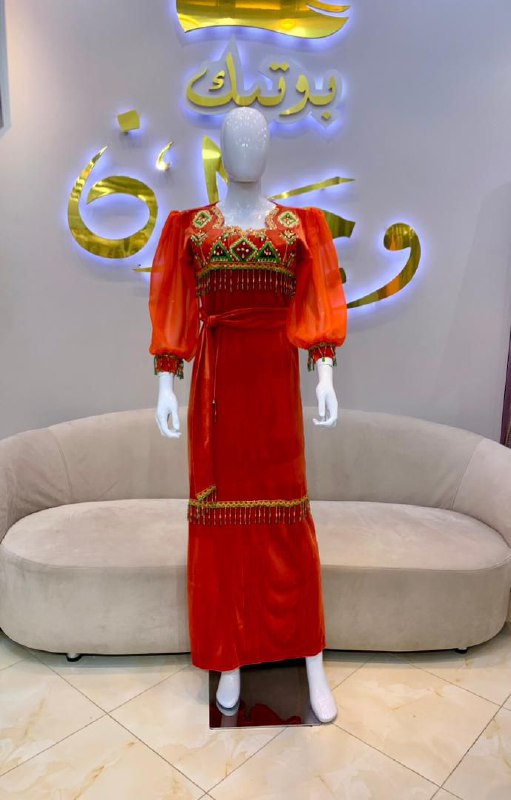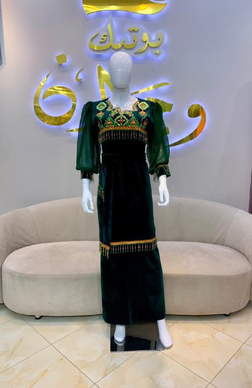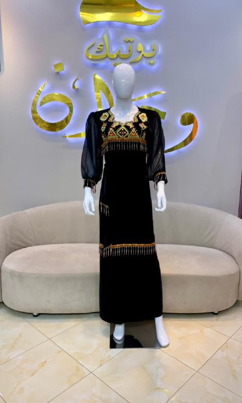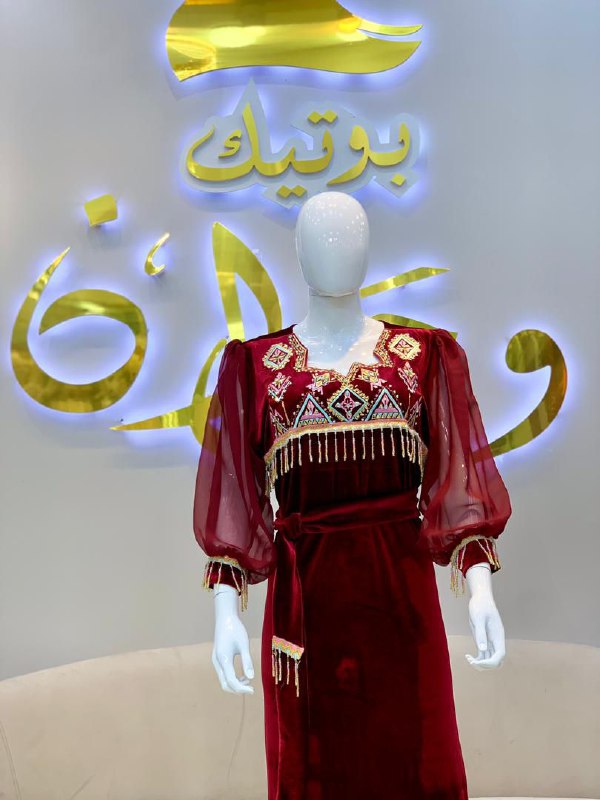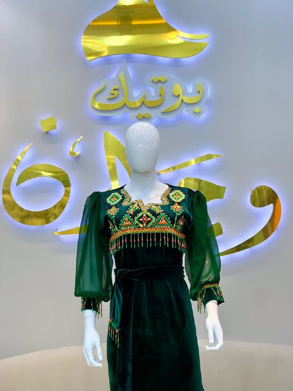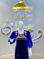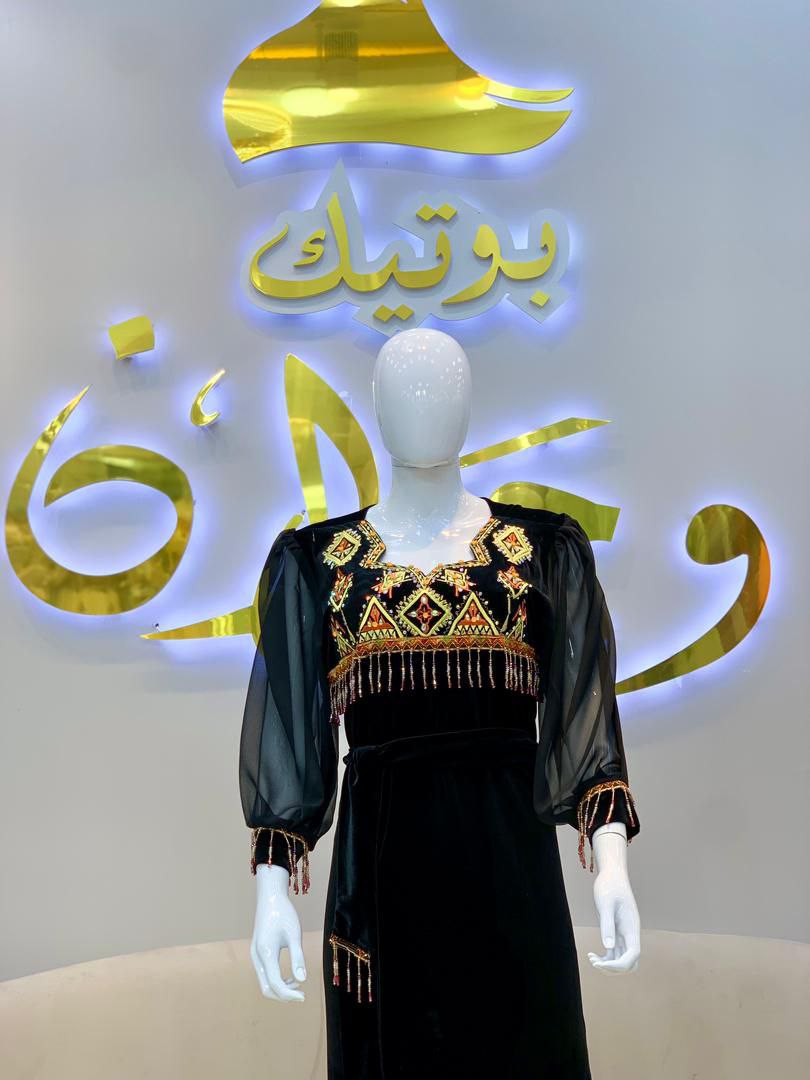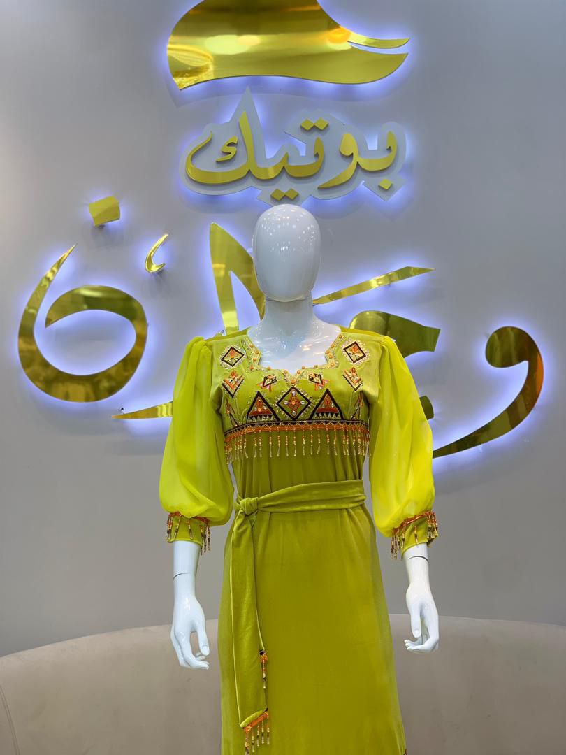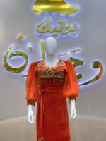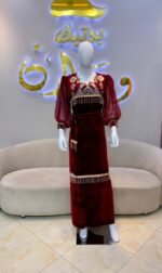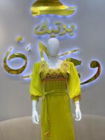 تُبرز الأكمام الواسعة المزينة بنقوش فنية دقيقة جمال الفستان، وتضيف لمسة من الأنوثة والرقي. كما أن التفاصيل المعدنية الأنيقة المُنسّقة على طول الفستان تعكس ذوقاً رفيعاً، بينما تضفي الزخارف الفنية لمسة جمالية تعزز من جاذبية كل قطعة.